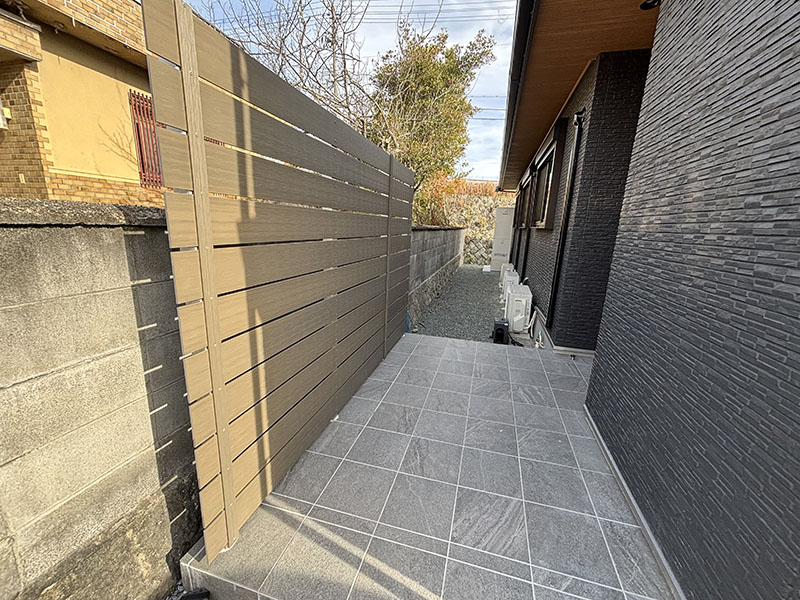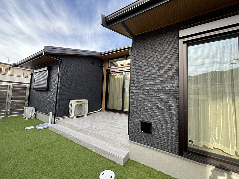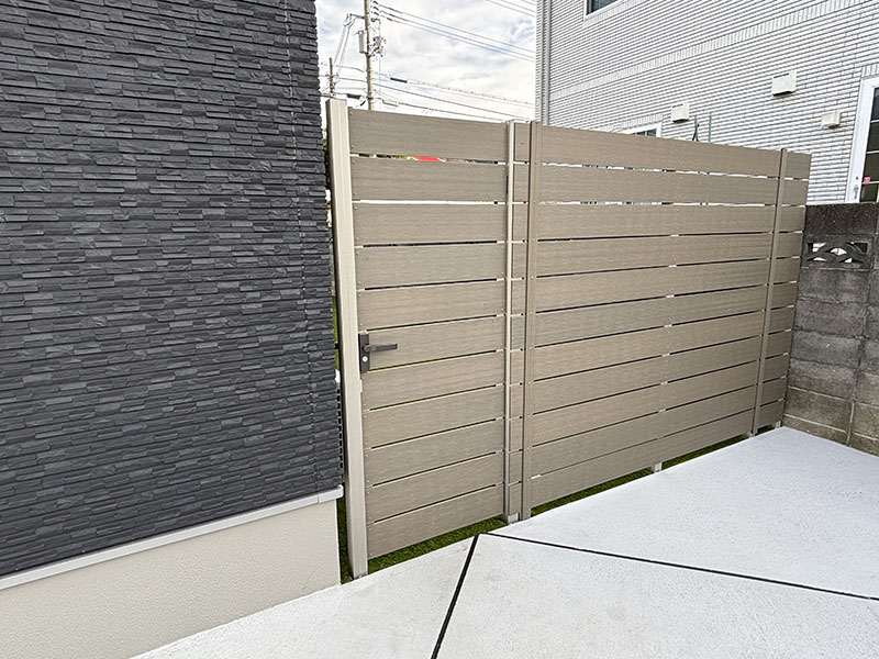 タイルデッキ前には人工芝を敷き詰め、駐車場と中庭の境には木樹脂フェンス(H1800)と同サイズの扉を設置し、プライバシーに配慮した空間としています。