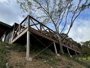「ウッドデッキを設置したい」とのご相談をいただき、現地を確認したところ、法面(傾斜地)にどのような構造でデッキを設けるかが大きな検討ポイントとなりました。