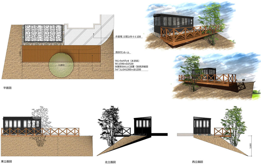 あわせて鉄工所とも協議を行い、下地を鉄骨構造とし、その上にウリン材のデッキとフェンスを設置するプランをご提案しました。
